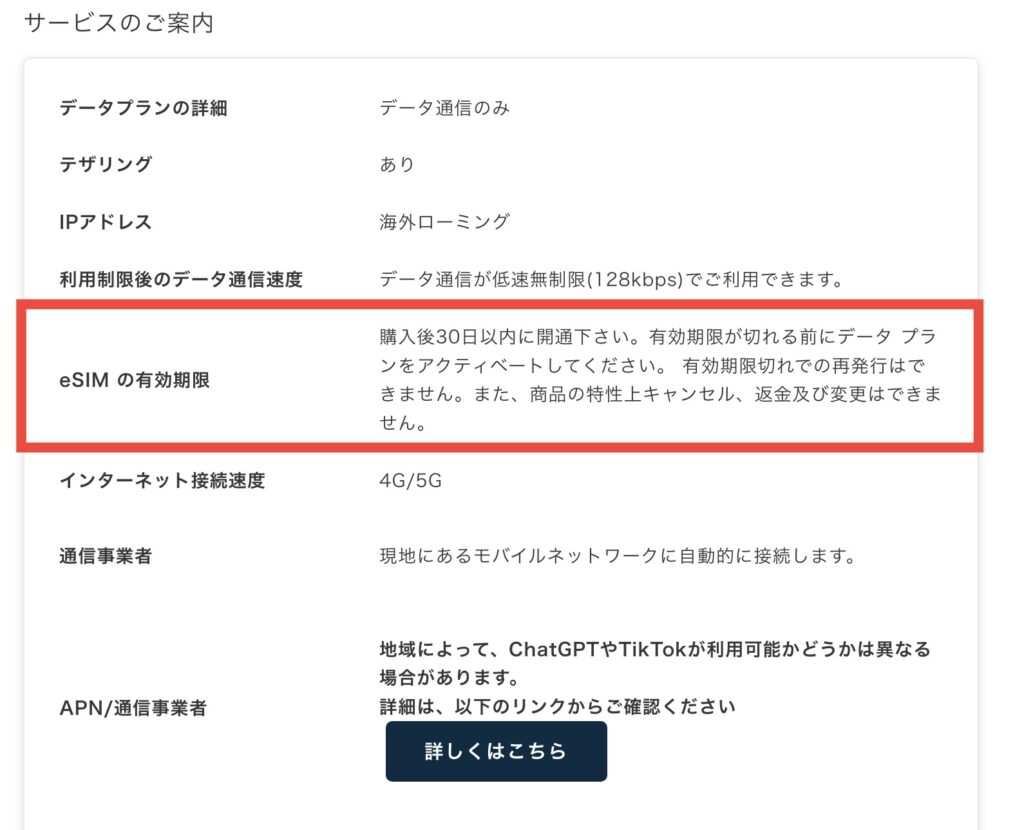 JAPAN&GLOBAL eSIMには有効期限があり、購入後30日以内に開通を行わないと期限切れになってしまいます。
